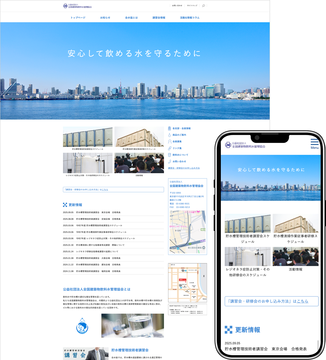 飲料水槽や貯水槽の清掃及び衛生管理に関する技術の向上や清掃管理業者の健全な育成、ビル等における飲料水の衛生的供給を図っている団体。信頼性があり、清潔感があるイメージにデザインを一新し、わかりやすいサイトにしたい。